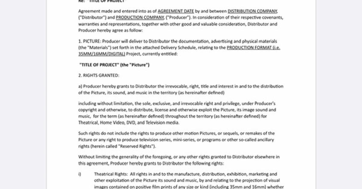 Here is a 21-page Extensive Film Distribution Agreement what your deal with a distributor could contain and gives you a template to move forward on. Always get an entertainment lawyer to check your deal.